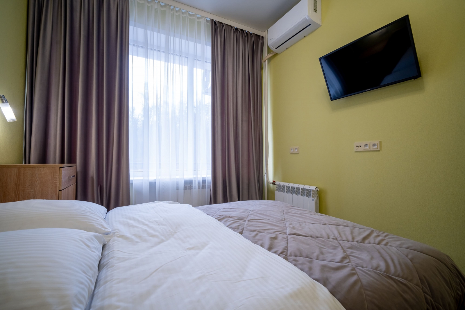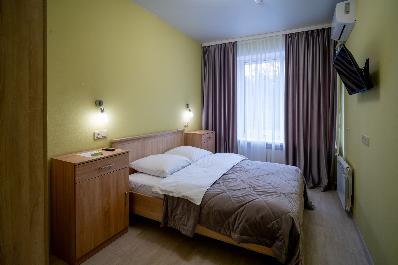 Светлый номер с современным дизайном и ремонтом, площадью 19,5 кв.м. В номере большая двухспальная кровать, а также: